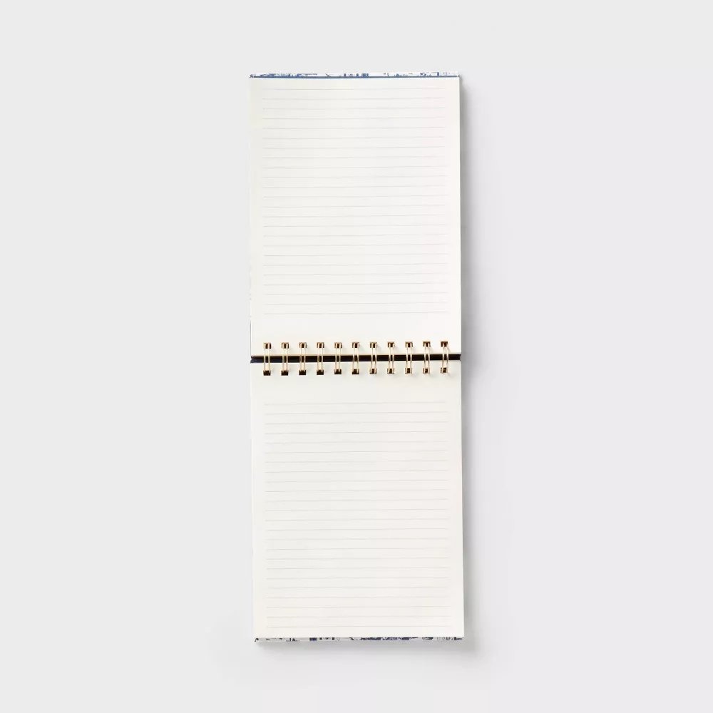 Add pastoral freshness to your writing experience with this Top Spiral Toile Notebook from  This hardcover notebook features 240 double-sided, college-ruled lined pages, making it perfect for taking notes, work planning, organizing thoughts and more. It features a navy blue-top hardcover adorned with a light blue toile print against a white background for a serene look. The top spiral binding in gold tone and “Notebook” heading finish off the lovely look.
